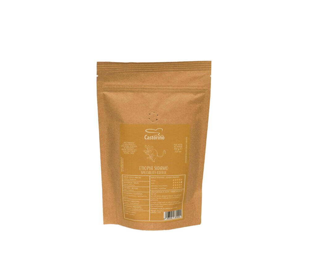 Grãos de café inteiros etíopes Sidamo são um café especial com sabor intenso com notas de jasmim e lima. Estes incluem suavidade e um aroma cítrico. Esses grãos também produzem um café terroso com acidez adicionada e um retrogosto brilhante.